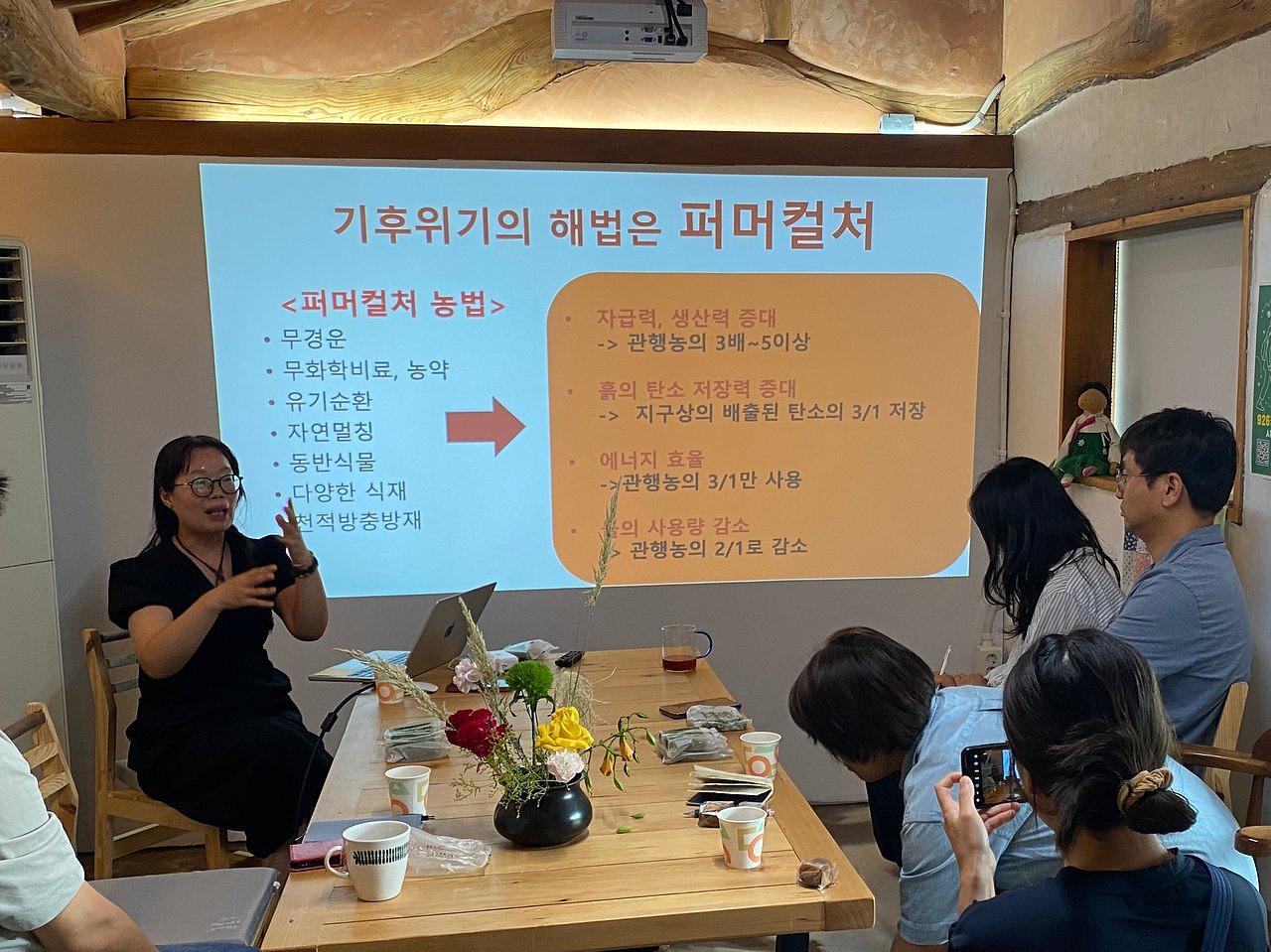 유희정 한국 퍼머컬처 네트워크 대표를 모시고 두 시간 동안 퍼머컬처에 대한 이야기를 들었습니다. 영국에서는 초등학생 때부터 퍼머컬처를 교과 과목으로 배운다고 합니다. 기후위기 시대, 우리는 농업을 놓치고 있습니다. 에너지 전환만으로는 부족합니다. 화석 에너지에 기반한 관행 농업을 소농 중심의 생태 농업으로 전환해야 합니다. 퍼머컬처 운동은 이러한 문명 전환의 실마리를 품고 있는 듯 합니다.